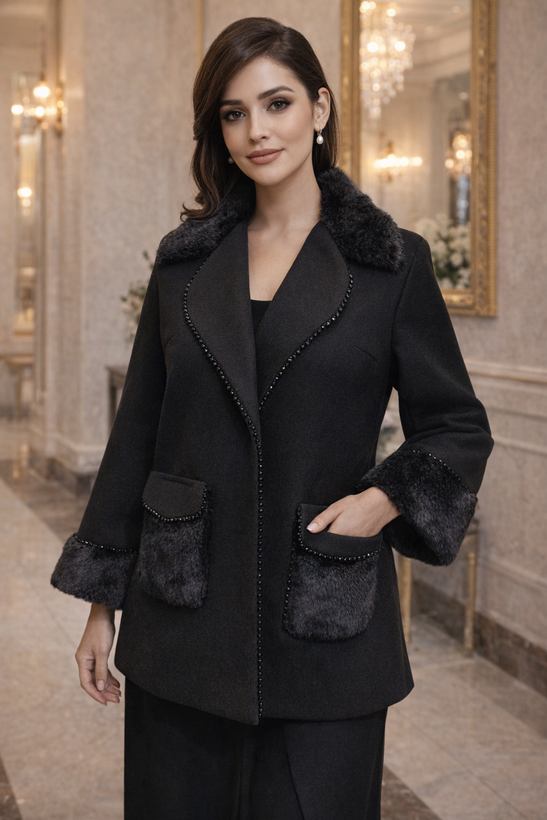 علاوه بر خز، لبههای یقه و جیبها با مروارید دوزیهای مشکی و ظریف تزئین شدهاند تا جزئیات هنری کار دوچندان شود. قد ۸۰ سانتیمتری این کت، آن را برای ست کردن با شلوارهای پارچهای کلاسیک یا دامنهای زمستانی بسیار مناسب ساخته است. این کار به صورت تک رنگ مشکی تولید شده تا به راحتی با هر رنگ اکسسوری ست شود و در عین حال، اندام شما را خوشفرم و کشیده نشان دهد.